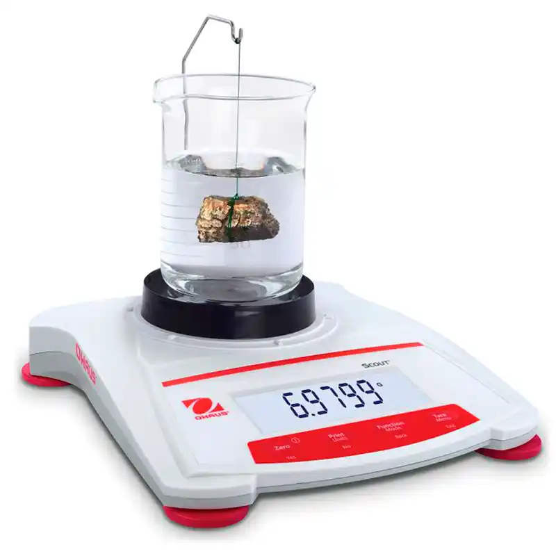 Determinación de densidad: la balanza viene equipada con un gancho inferior que facilita el cálculo de la densidad de los materiales, lo cual es esencial en aplicaciones científicas.