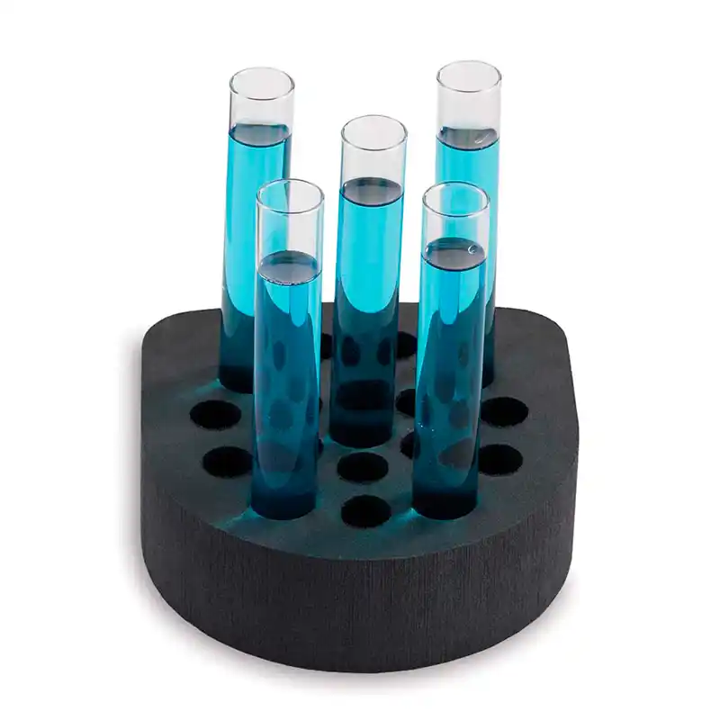 El inserto de espuma para tubos de ensayo de 19–21 mm permite sostener hasta 18 tubos de ensayo de mayor diámetro, ofreciendo una sujeción firme durante la agitación.